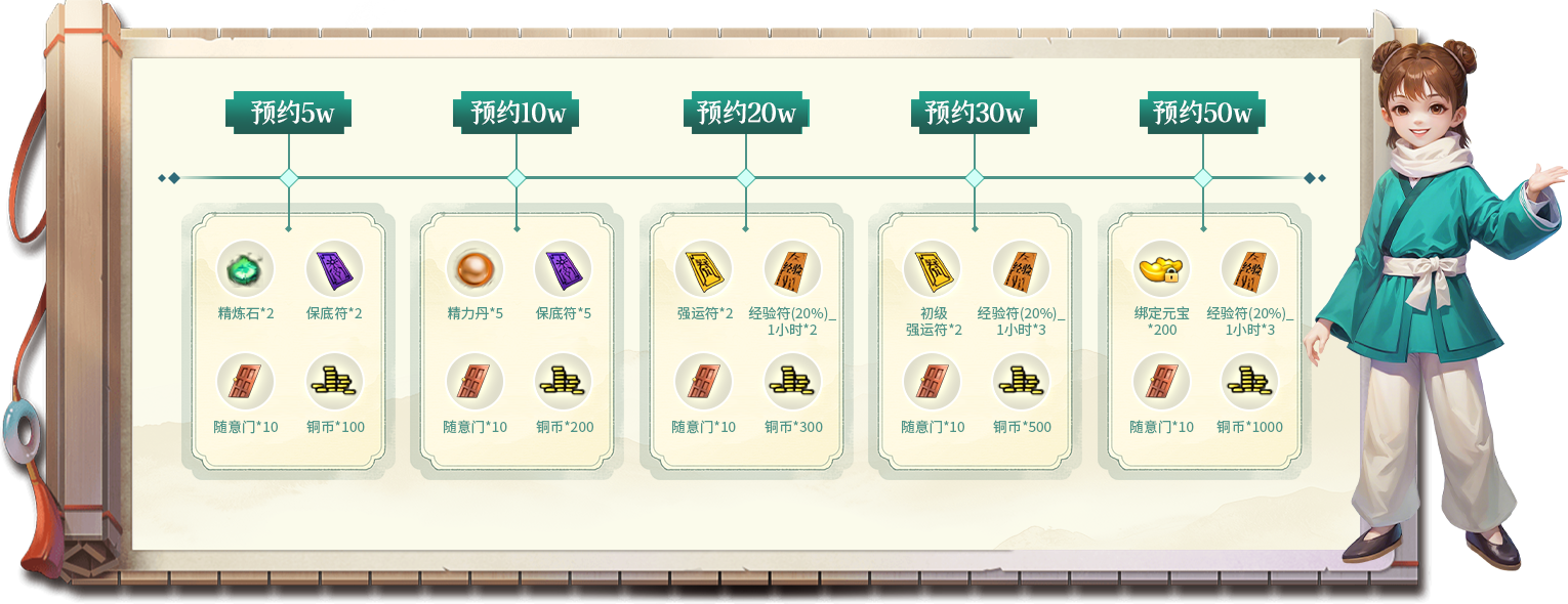注意:预约奖励将在角色达到15级,17级,19级,20级,22级,25级时以邮件的形式分阶段发放(例如15级时发放预约奖励,17级时发放预约人数达到5万奖励)。 行走江湖,最重要的就是实力! 专属福利加码!得限时7天尊享特效称号「武林有侠气」,身披流光,尽显侠名!属性加成助你开服冲级刷怪先机尽握!